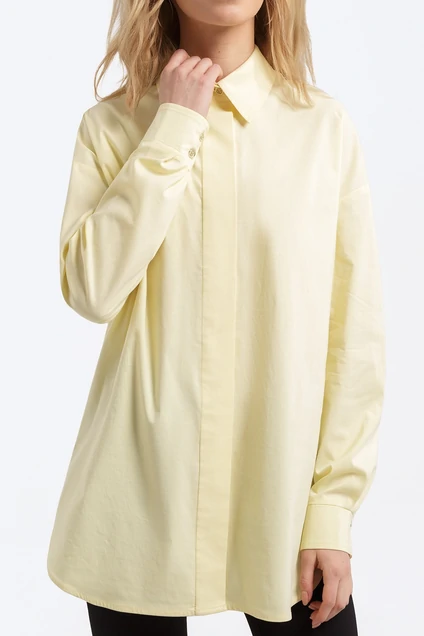 Хлопковая рубашка свободного покроя. Детали: прямой силуэт, спущенная линия плеча, рубашечный воротник, потайная застежка на петли и пуговицы, кокетка переда и спинки, рукава длинные с манжетами