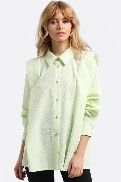 Хлопковая рубашка из текстильной ткани с эффектом «крэш». Детали: акцентный плечевой пояс, свободный покрой, прямой силуэт, рубашечный воротник, застежка на петли и пуговицы, рукава длинные втачные с манжетами