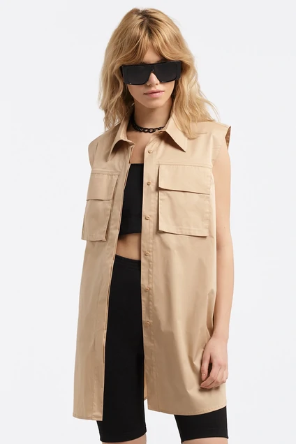 Удлиненная хлопковая рубашка без рукавов. Детали: трапециевидный силуэт, кокетка переда и спинки, большие накладные карманы с клапанами, рубашечный воротник, потайная застежка на петли и пуговицы, фигурный низ
