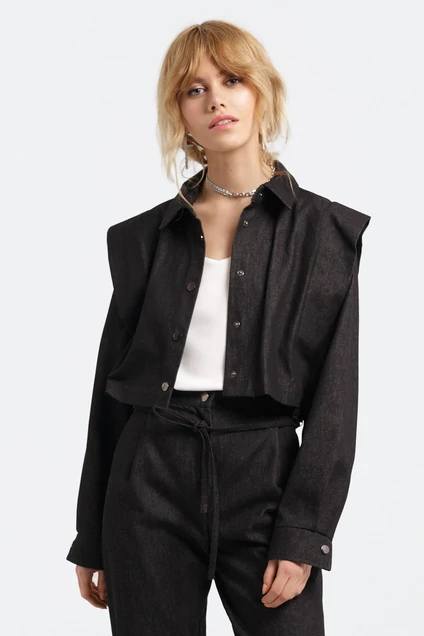 Джинсовая укороченная куртка-рубашка. Детали: свободный покрой, прямой силуэт, акцентный плечевой пояс, рубашечный воротник, застежка на петли и пуговицы, рукава длинные втачные с манжетами