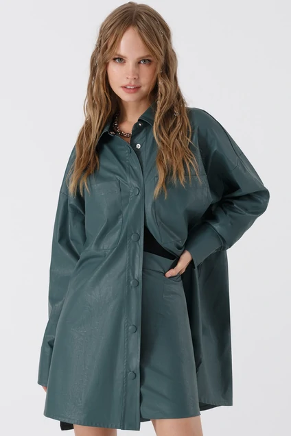 Удлиненная рубашка свободного покроя из искусственной кожи. Детали: прямой силуэт, спущенная линия плеча, накладные карманы, рубашечный воротник, застежка на пуговицы, рукава длинные с манжетами, фигурный низ с разрезами по бокам