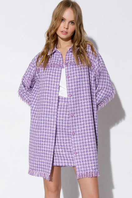 Удлиненная свободная рубашка с бахромой из текстильной ткани в клетку. Детали: прямой силуэт, спущенная линия плеча, рубашечный воротник, застежка на кнопки, рукава длинные с манжетами