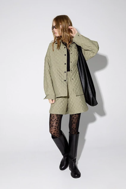 Рубашка свободного покроя из текстильной стеганой ткани. Детали: прямой силуэт, спущенная линия плеча, рубашечный воротник, застежка на кнопки, рукава длинные на манжетах, низ фигурный с высокими разрезами