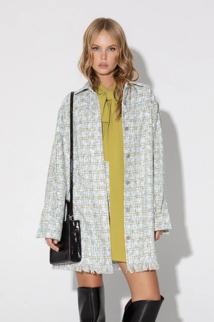 Удлиненная свободная рубашка с бахромой из текстильной бархатистой ткани в клетку. Детали: прямой силуэт, спущенная линия плеча, рубашечный воротник, застежка на петли и пуговицы, рукава длинные с манжетами