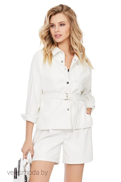 Рубашка свободного покроя из искусственной кожи со съемным поясом. Детали: прямой силуэт, спущенная линия плеча, рубашечный воротник, перед с нагрудным карманом, застежка на пробивные кнопки, рукава длинные на манжетах, низ фигурный с высокими разрезами, съемный пояс с металлической пряжкой