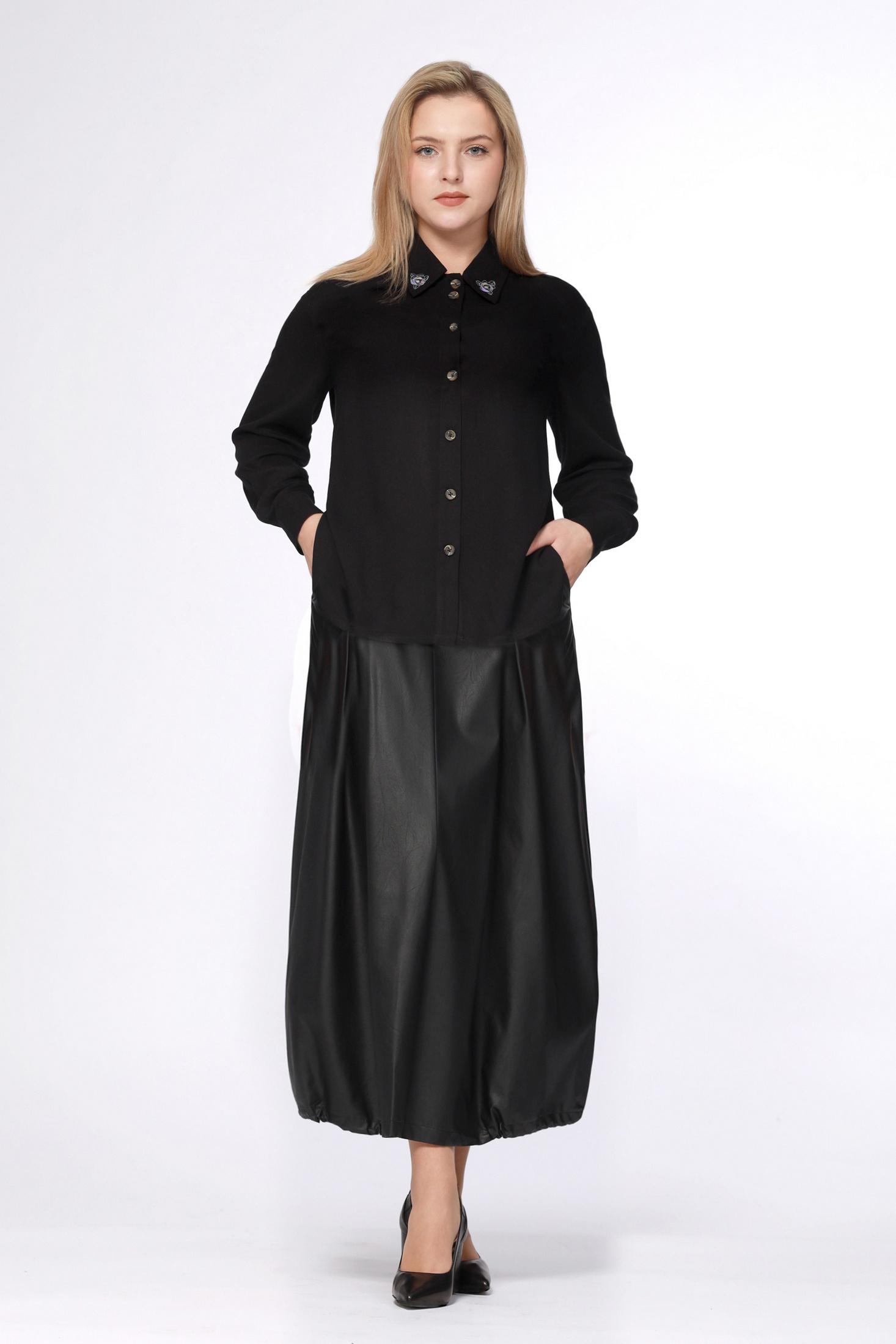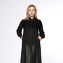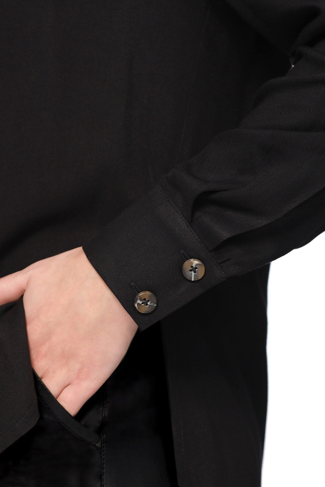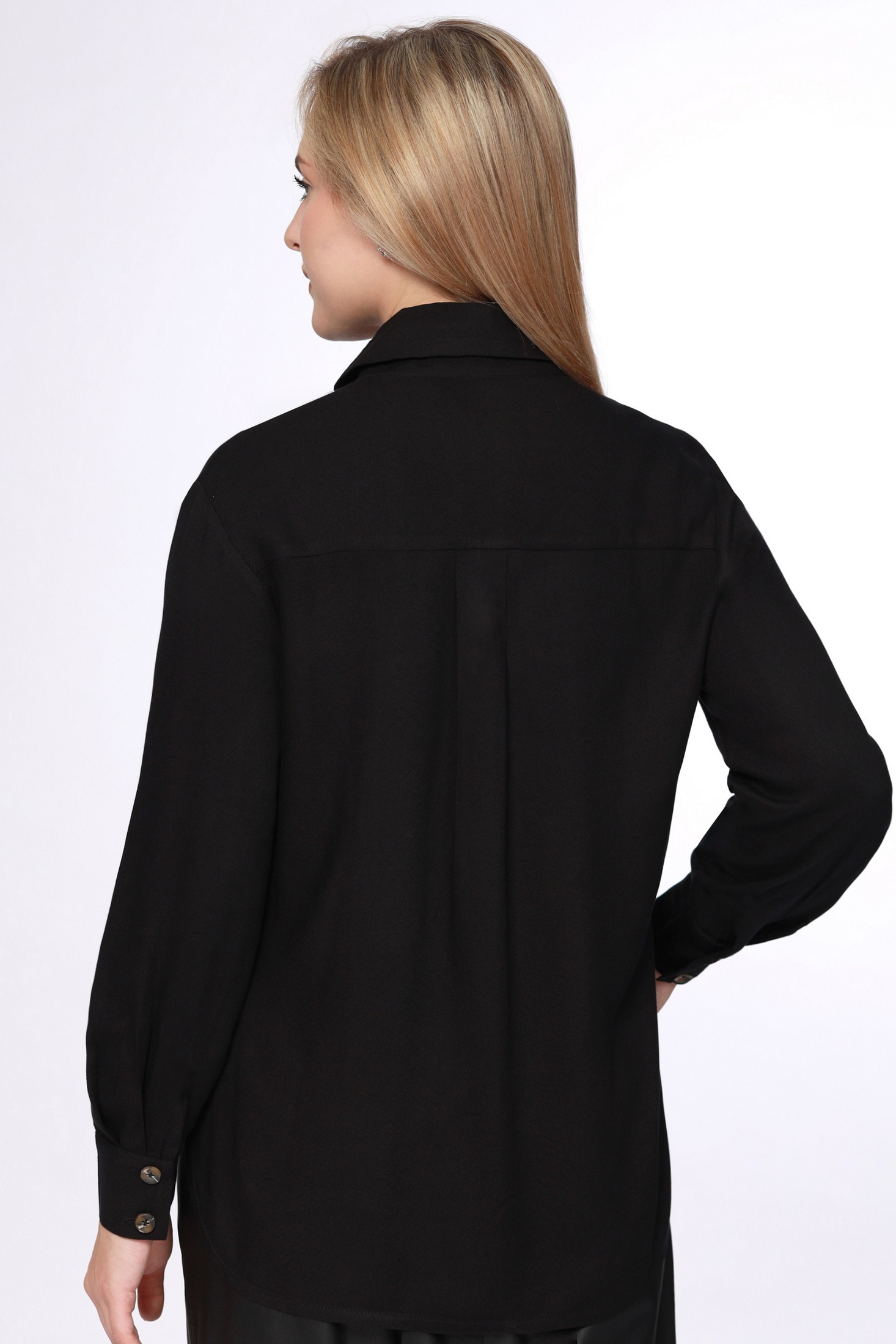 Блузка женская свободного кроя из мягкой вискозы. Низ асимметричный фигурный с боковыми разрезами. Перед с нагрудными вытачками из проймы. Втачной длинный рукав на манжете с двумя пуговицами. Без карманов. Стояче отложной воротник декорирован на уголках ручной художественной росписью - розочки. Застёжка - пуговицы на планке. Спинка с кокеткой и бантовой складкой от неё. Длина рукава с учётом манжета - 57 см. Длина по спинке - 69 см.
