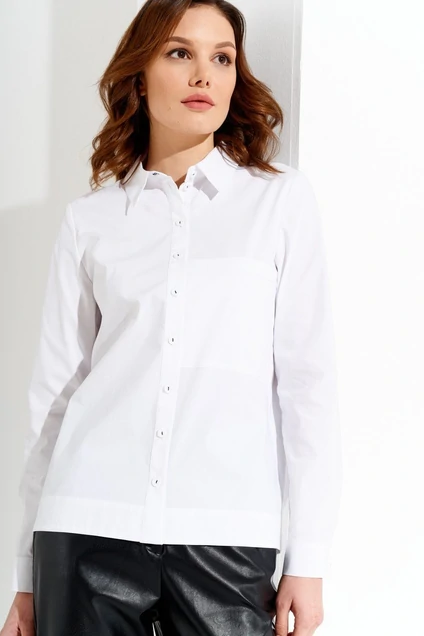 Классическая хлопковая рубашка прямого силуэта с застежкой на планку с пуговицами. По полочке накладной карман, воротник стояче-отложной. Длинные рукава с притачной манжетой, с застежкой на пуговицы. По среднему шву спинки декоративный разрез с патой на кнопке. Оригинальность модели придает вертикальная вышивка на спине.