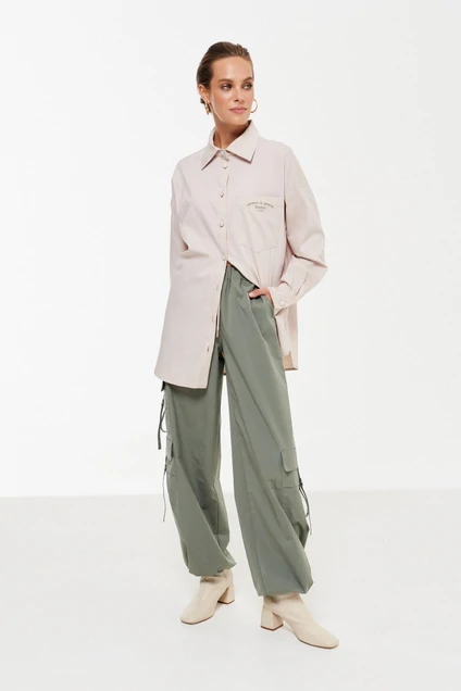 Блуза прямого кроя из хлопковой ткани. Воротник стояче-отложной . Линия плеча спущена . Рукава длинные на манжете. По спинке отрезная кокетка. Авторская вышивка на кармане. Низ блузки фигурный.