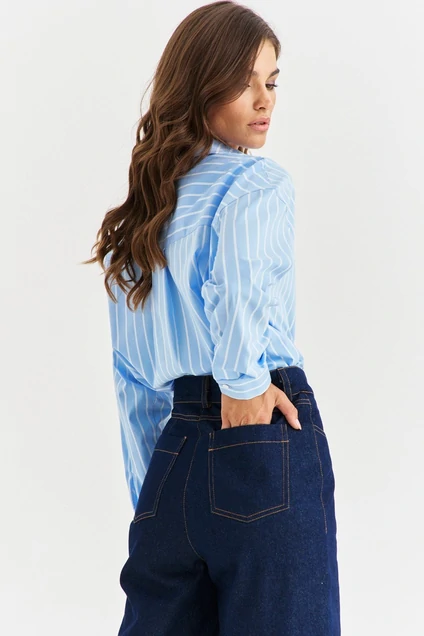 Рубашка свободного кроя, длиной ниже линии бедер, с разрезами по боковым. По спинке кокетка и встречная складка от нее. По переду, с левой стороны настрочен накладной карман. Рукав одношовный, втачной, длинный. По низу рукава обработан разрез, складки и притачная манжета. По горловине воротник рубашечного типа на отрезной стойке.
