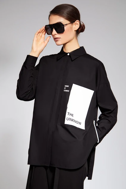 Блуза-рубаха свободного кроя из хлопка, с авторским декором. На полочке два больших кармана, один из которых – с контрастной печатью (эффект пленки). Ассиметричный низ в боковых швах, с функциональной застежкой на «тракторную» молнию. В чёрном варианте рубахи молния белая. Небольшой декор-акцент на спинке. Верхняя пуговица на планке и верхние пуговицы манжет – контрастного цвета. Длина 77.