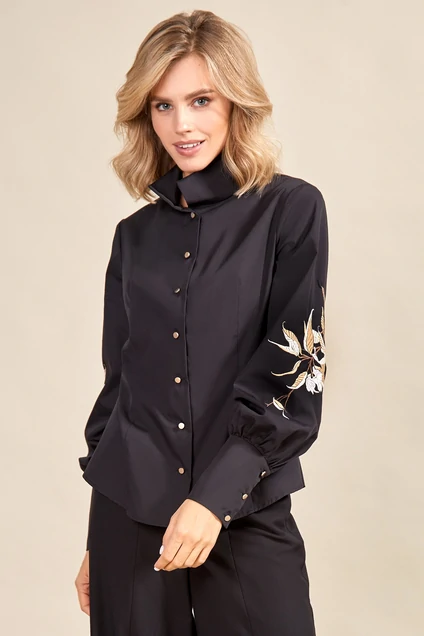 Блуза прилегающего силуэта. Воротник классический, отложной. На планке застежка на петли-пуговицы. Рукава втачные с высокой манжетой, декорированные авторской вышивкой. Низ блузки фигурной формы.