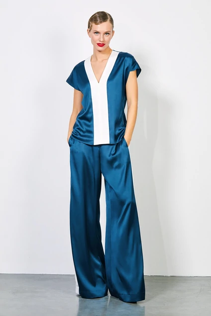 - по переду горловина обработана планками контрастного цвета, продленными до низа