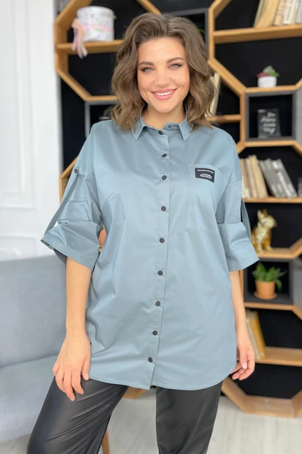 Рубашка хлопковая прямого силуэта. Перед рубашки с кокетками и нагрудными вытачками. На левой половинке накладной карман. Горловина оформлена воротником со стойкой. Спинка с кокеткой и бантовой складкой. Рукав спущенный с патой. Пата фиксируется кнопкой. Низ изделия на боковых швах с лёгким закруглением. Рубашка застегивается на кнопки.