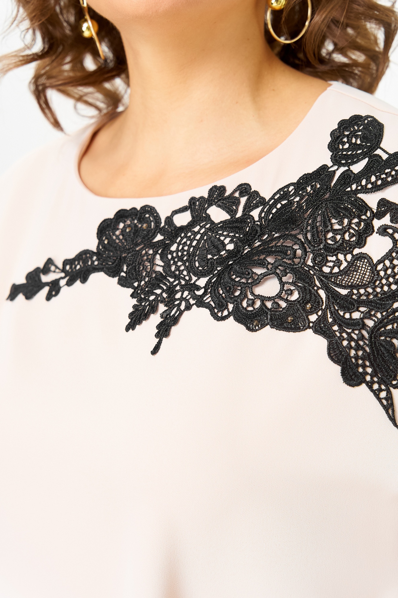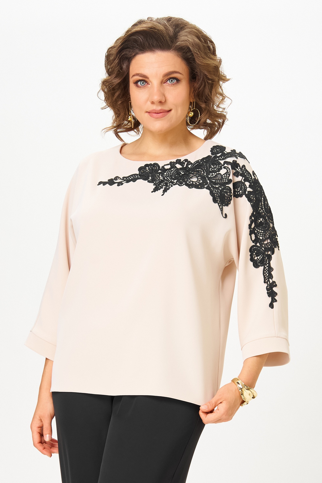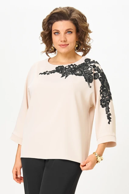 Элегантная женская блузка пастельного бежевого цвета, выполнена из приятной на ощупь текстильной ткани. Блузка прямого силуэта с длиной по спинке 64 см и длиной рукава 57 см, что обеспечивает комфортное прилегание. Модель оснащена цельнокроеными рукавами 3/4, завершенными аккуратной манжетой, что придает изысканность образу. Главной изюминкой дизайна является настрочная аппликация из черного кружева, оформленная в виде изящного узора, который начинается на одном плече и перетекает на переднюю часть блузки. Этот элемент добавляет роскоши и утонченности. Круглый вырез горловины обработан тонкой обтачкой, подчеркивающей линию шеи. Застежка-петля с пуговицей на спине облегчает надевание. Средний шов по спинке помогает формировать аккуратный силуэт. Изделие подойдет как для офисного, так и для торжественного гардероба, легко комбинируясь с классическими брюками или юбками.
