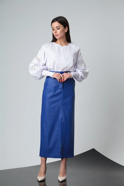 Блузка женская из лёгкой хлопковой ткани, прямого силуэта. Оригинальна в исполнении с художественной вышивкой по рукавам. По центру переда планка на 11 петель и столько же пуговиц. Рукав реглан, по низу рукава манжета присборена на эластичную тесьму (венгерку) для фиксации. Горловина округлой формы, по горловине изделия декоративные защипы .