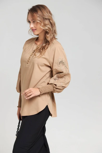 Блузка женская из лёгкой хлопковой ткани, прямого силуэта. Оригинальна в исполнении с художественной вышивкой по рукавам. По центру переда планка на 11 петель и столько же пуговиц. Рукав реглан, по низу рукава манжета присборена на эластичную тесьму (венгерку) для фиксации. Горловина округлой формы, по горловине изделия декоративные защипы .