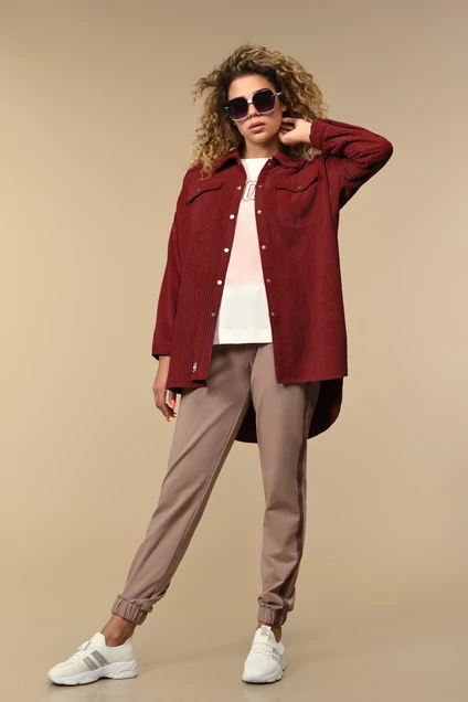 Блузка женская свободного силуэта. Центральная застежка на кнопки. Воротник рубашечный на стойке. По спинке и полчке-двойные кокетки. П полчке блузки накладные карманы с клапанами. По боковым швам разрезы. Внизу рукава манжеты на кнопках. Низ спинки длиннее чем полочки. По низу полочки декоративная печать. Длина изделия - 83 см, длина изделия по полочке – 69 см, длина рукава -65 см.