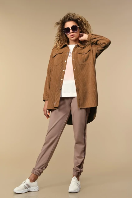 Блузка женская свободного силуэта. Центральная застежка на кнопки. Воротник рубашечный на стойке. По спинке и полчке-двойные кокетки. П полчке блузки накладные карманы с клапанами. По боковым швам разрезы. Внизу рукава манжеты на кнопках. Низ спинки длиннее чем полочки. По низу полочки декоративная печать. Длина изделия - 83 см, длина изделия по полочке – 69 см, длина рукава -65 см.