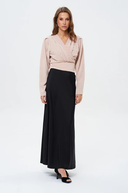 Невероятно нежная, укороченная блузка из струящейся ткани, пудрового оттенка, с V-образным вырезом, акцентом на драпировках, длинным рукавом и зауженной талией. Прекрасно сочетается с любым низом и прослужит вам не только в праздники.