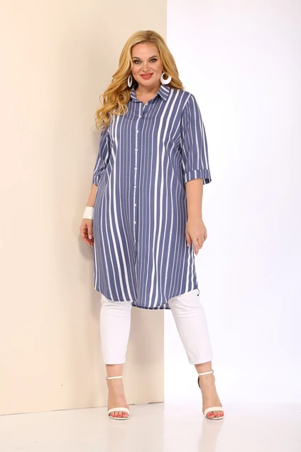 Летнее платье-рубашка в полоску станет идеальной базой Вашего гардероба на весну и лето! Перед с нагрудными вытачками и застежкой на петли и пуговицы. Воротник рубашечного типа с отрезной стойкой. Рукав втачнойт ¾ на манжете. Карманы расположены в боковых швах. За счет вертикального направления линий рисунка фигура кажется еще более стройной и зрительно вытягивается силуэт. Модное платье-рубашка позволит Вам превосходно выглядеть, как на прогулке, на отдыхе, так и в офисе. Его можно носить как самостоятельный элемент образа или дополнять наряды в расстегнутом виде. Длина изделия по спинке 108 см. Длина рукава 40 см.