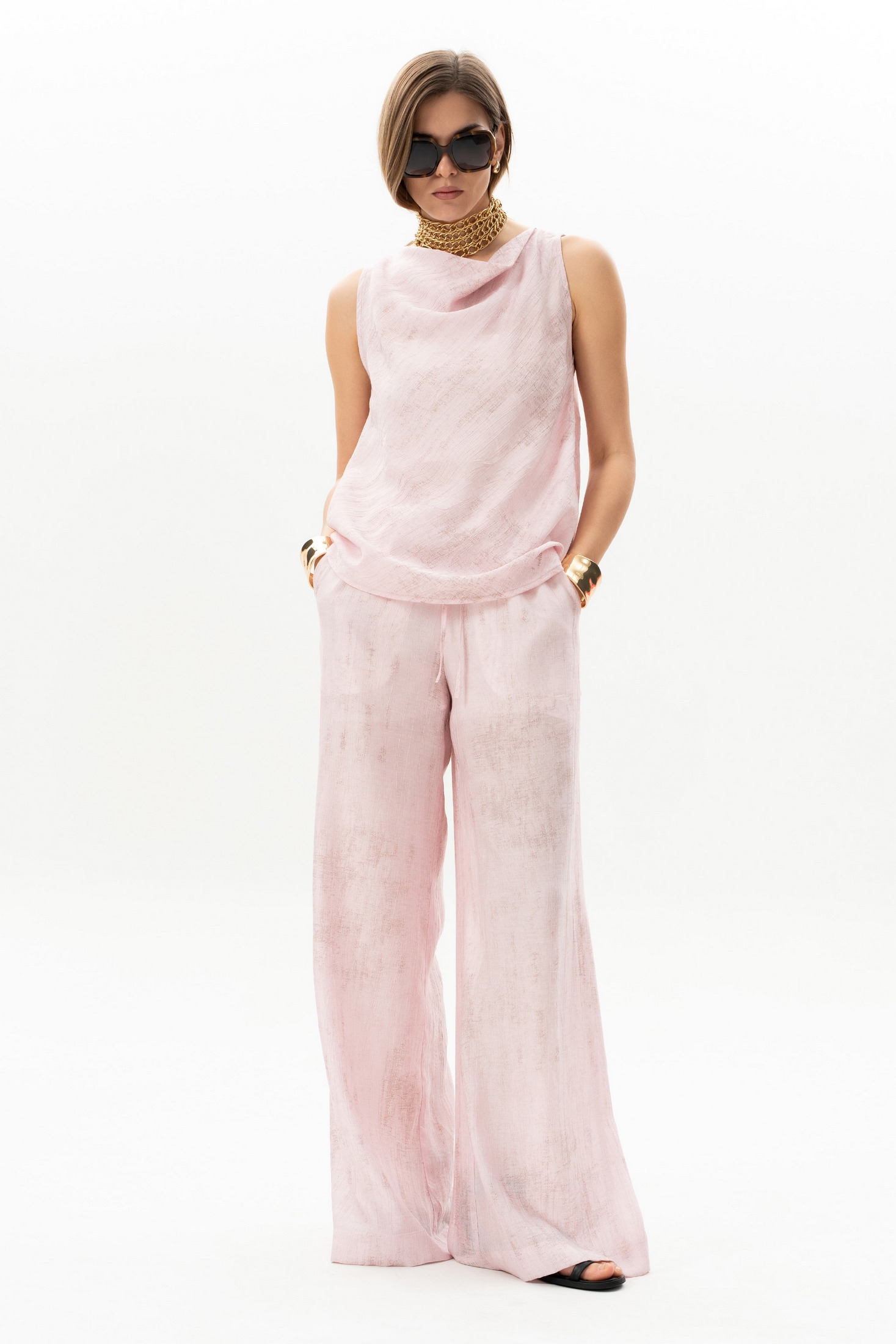 Блузка прямого кроя с асимметричной горловиной без рукавов. Длина блузки по центру спинки 59 см.
