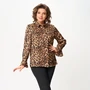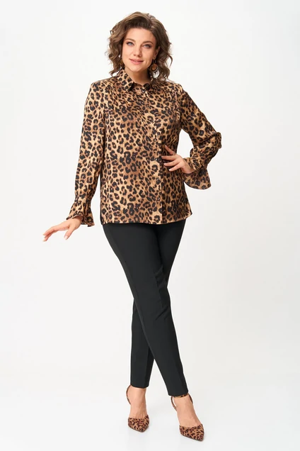 Блузка женская прямого силуэта, выполнена из блузочной ткани с анималистичным принтом. Спинка цельная с кокеткой по линии лопаток и встречной складкой по центру. Перед с плечевой кокеткой и сборкой из нее.