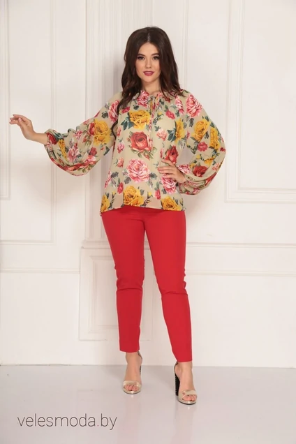 Комплект женский двухпредметный состоит из топа на бретелях и очень нарядной блузки из тонкого шифона с купоном. Основным украшением блузки служит рукав. Рукав состоит из трех частей. Верхняя часть рукава реглан, по средней части рукава идет два фигурных подреза со сборкой. Заканчивается рукав резинкой. Блуза свободного кроя. Горловина-стойка. По переду обработан разрез и завязывается на завязку.