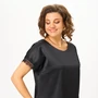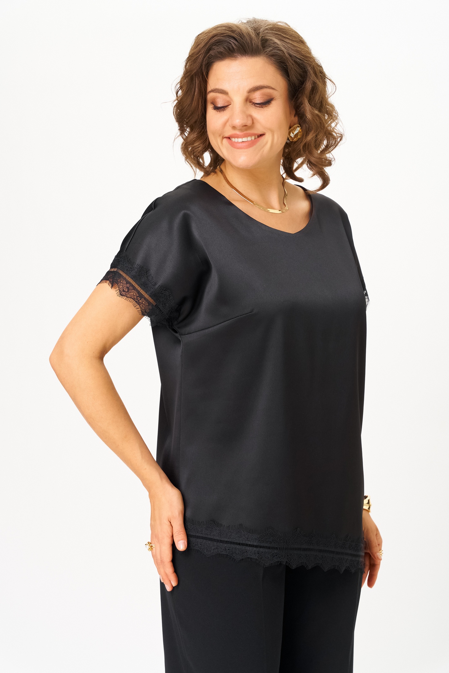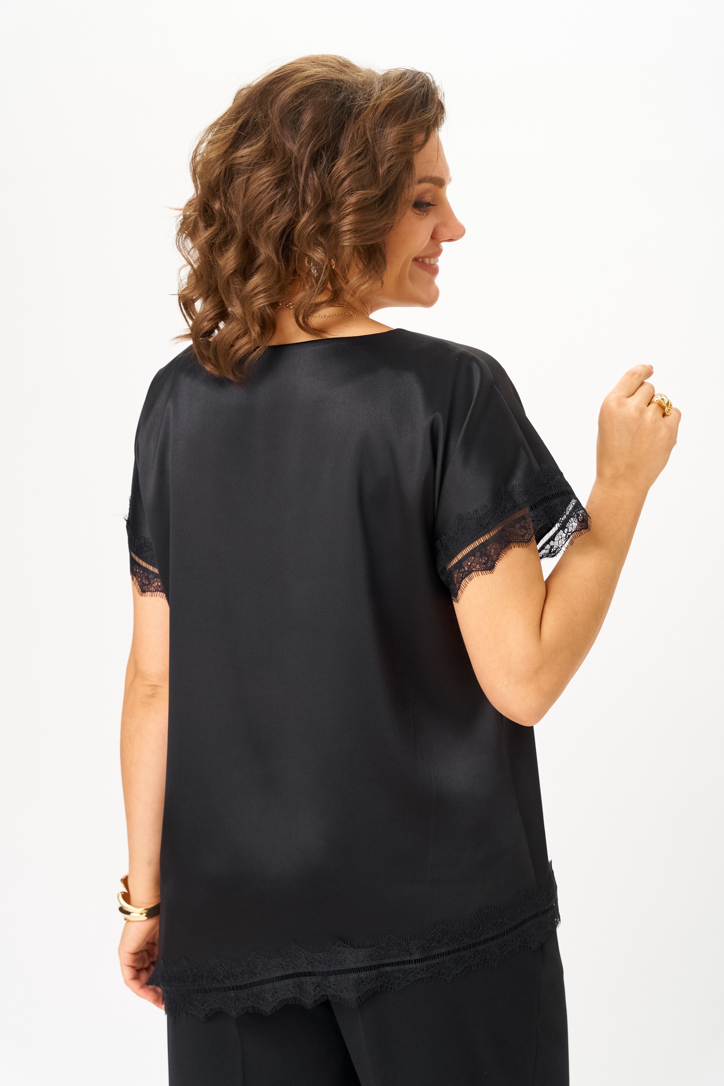 Элегантная женская блузка черного цвета выполнена из легкой ткани, что делает ее идеальным выбором для создания как повседневных, так и более официальных образов. Блузка свободного кроя с короткими спущенными рукавами добавляет нотку расслабленности и удобства. Особенный шарм изделию придают тонкие вставки из кружева, расположенные по низу рукавов и подола блузки, что добавляет изысканности в дизайн. V-образный вырез горловины эффектно подчеркивает линию шеи.