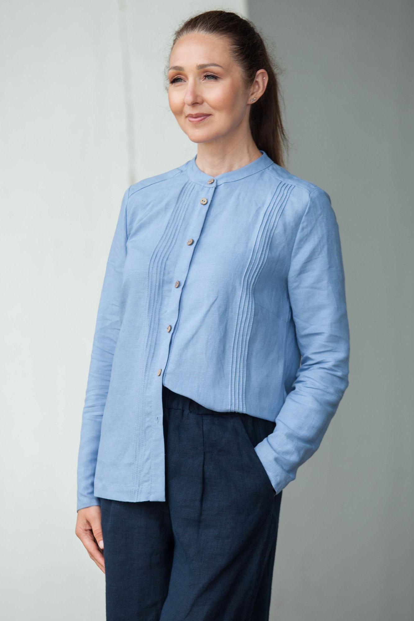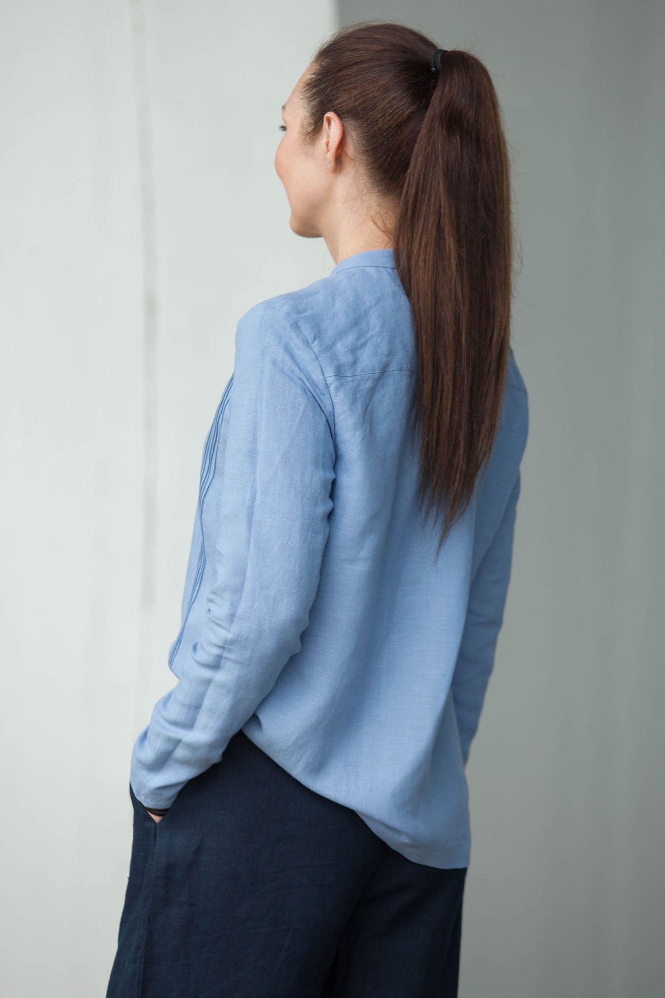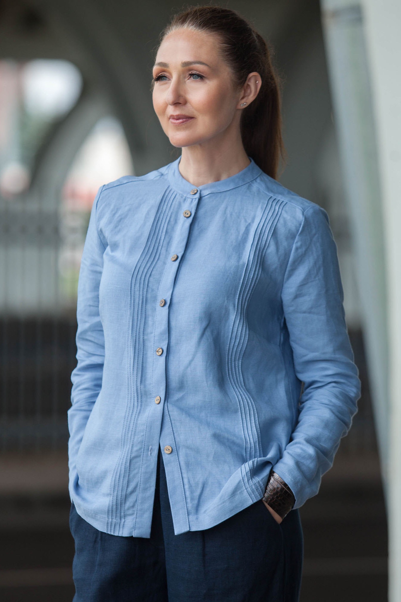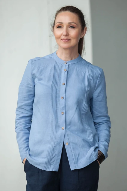 Рубашка классическая - подойдет для офисного стиля или нарядного образа. Выполнена из натуральной ткани 57% лен, 43% вискоза. Голубая рубашка - это классика, которая никогда не выходит из моды. Воротник стойка, без манжеты, длина рубашки средняя, на передних полочках ассемитричный элемент в виде линий, что придает рубашке некую необычность. Эта рубашка специально создана для женщин, которые ценят красоту и комфорт.