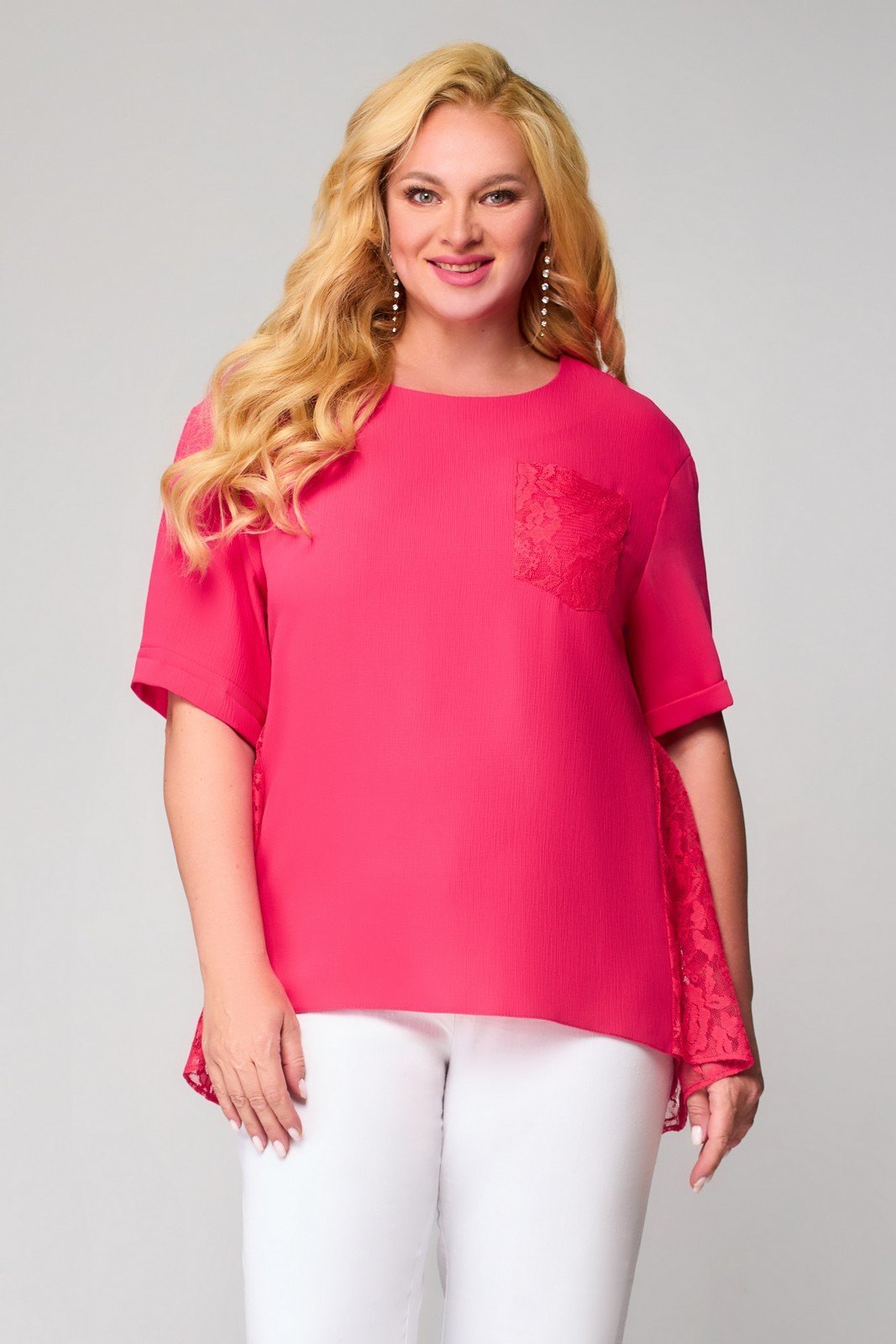 Блузка женская расширенная к низу с втачным спущенным рукавом. Горловина обработана бейкой. По левой части переда накладной карман. Спинка с кокеткой в верхней части, нижняя часть спинки из двух деталей со сборкой. Линия бокового шва спинки слегка смещена на деталь переда. Рукав короткий с отворотом. Нижняя часть спинки и накладной карман выполнены из хлопка «шитье».