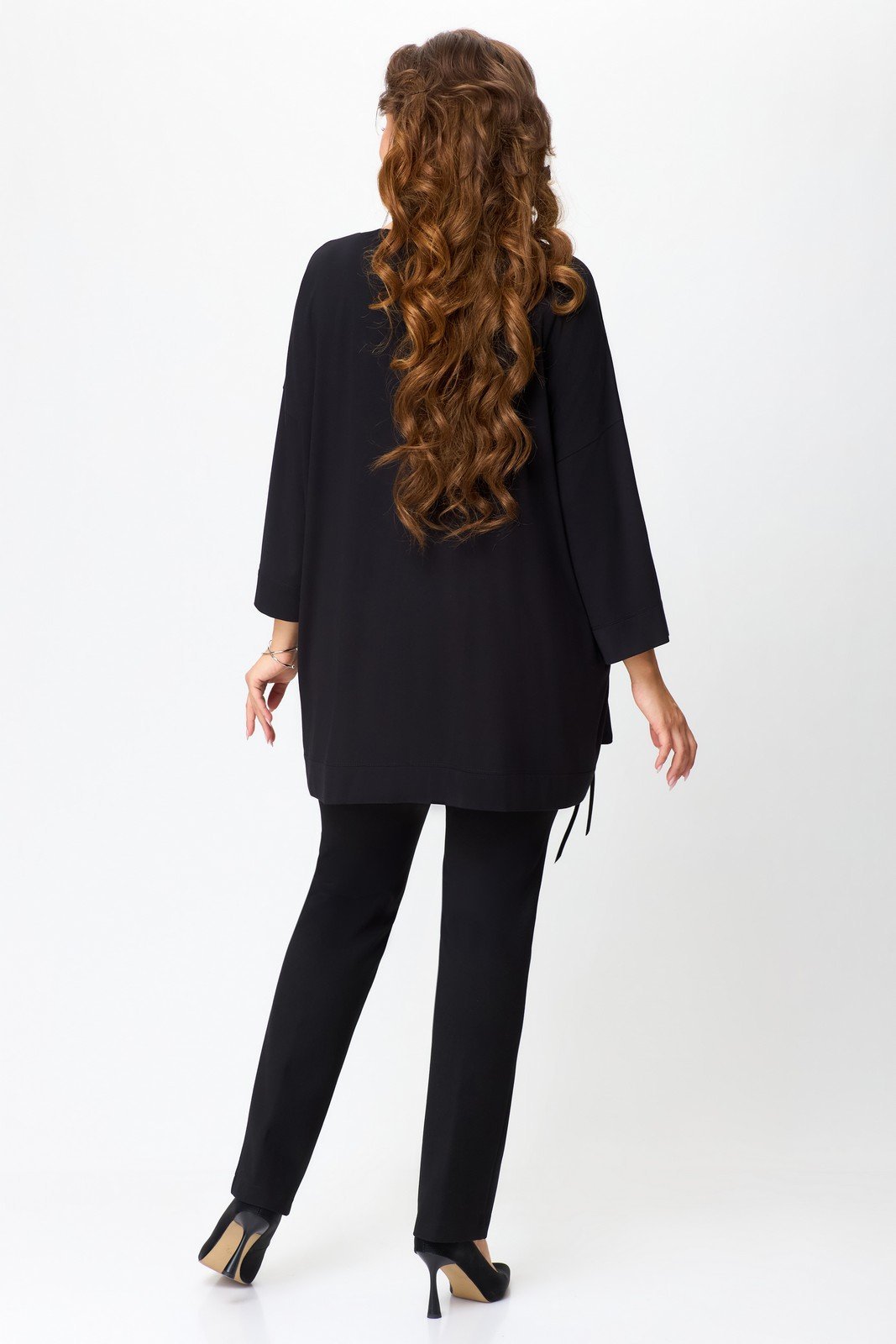 Блузка женская черного цвета, выполненная в свободном стиле "oversize", идеально подойдет для создания элегантного образа. Модель оснащена рукавами 7/8 с спущенной линией плеча, что добавляет изделию современного шарма. Горловина округлой формы с присборенной планкой аккуратно подчеркивает шею. В дизайне блузки привлекает внимание вставка из отделочной ткани с пайетками на передней части, что придает изделию изысканный вид. Блузка обладает асимметричным низом, который дополняется подрезом и легкой сборкой на кулису, создавая интересный объем и необычайную форму. Длина блузки по спинке составляет 73 см, а длина рукава от горловины — 75 см. Эта блузка станет идеальным выбором для тех, кто ценит комфорт без ущерба для стиля.
