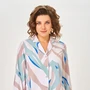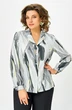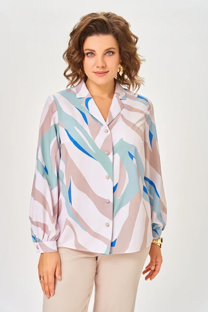 Блузка женская из мягкой вискозной ткани, прямого силуэта с центральной застёжкой на петли и декоративные пуговицы. По переду обработаны нагрудные вытачки, спинка цельная. Воротник пиджачного типа с отложными лацканами. Рукав втачной, одношовный длинный, внизу со сборкой и манжетой, которая застёгивается на петлю и пуговицу. Длина рукава - 62 см (+-1 см). Длина по спинке - 65 см (+-1 см).