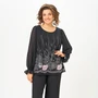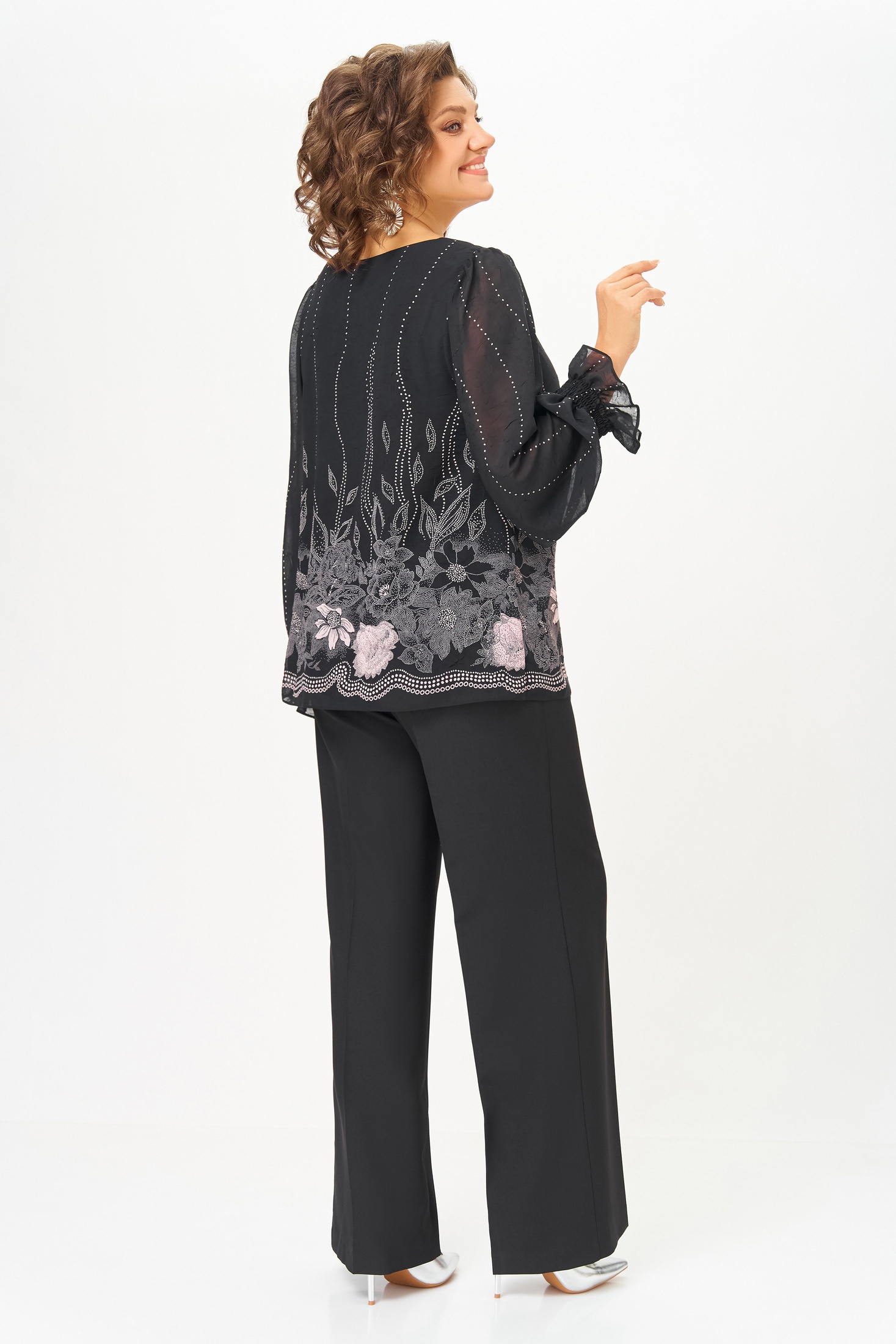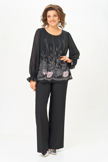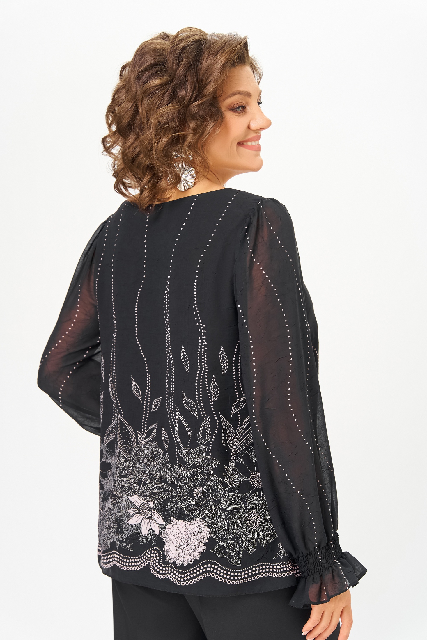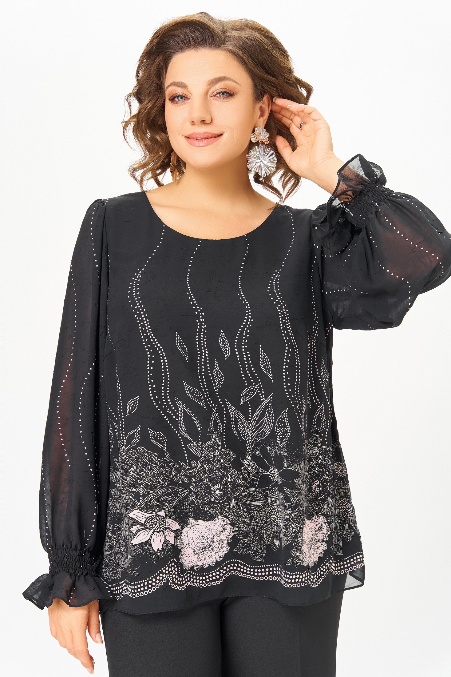 Блузка А-силуэта из нежной шифоновой ткани с лёгким эффектом «жатки», на подкладке из шифона. Полочка с нагрудными выточками, спинка без особенностей. Горловина круглая. Рукав втачной длинный по окату со сборкой, в нижней части собран на эластичную нить, которая внизу образует рюшу высотой 6 см. Длина по спинке в р.52-56 – 64 (+/-2) см? р. 58-62 – 68 (+/-2) см. Длина рукава – 64 см.