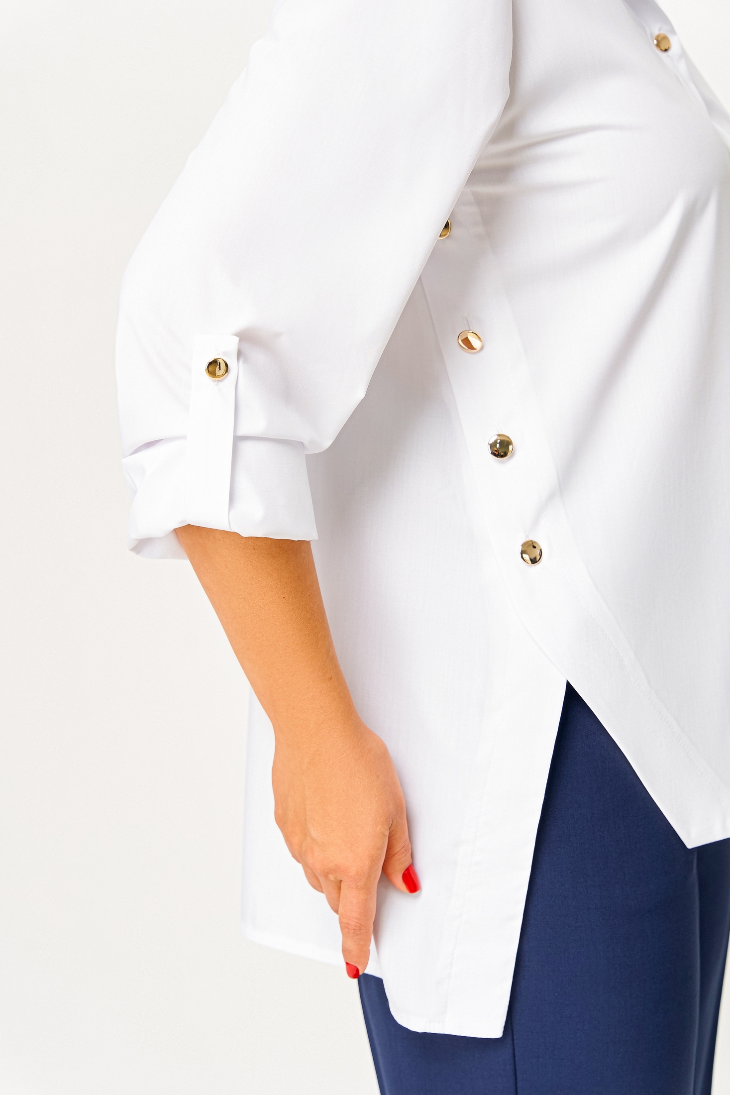 Рубашка женская прямого силуэта с центральной застёжкой на петли и декоративные пуговицы, выполнена из хлопчатобумажной ткани. Боковые швы полочки и спинки имеют фигурную форму и соединяются между собой застёжкой на петли и декоративные пуговицы. Воротник рубашечный, отложной на стойке. Рукав втачной, одношовный, длинный с манжетой, которая застёгивается на петлю и пуговицу, и патой, которой регулируется длина рукава. Низ рубашки разноуровневый, полочка короче, спинка -длиннее.