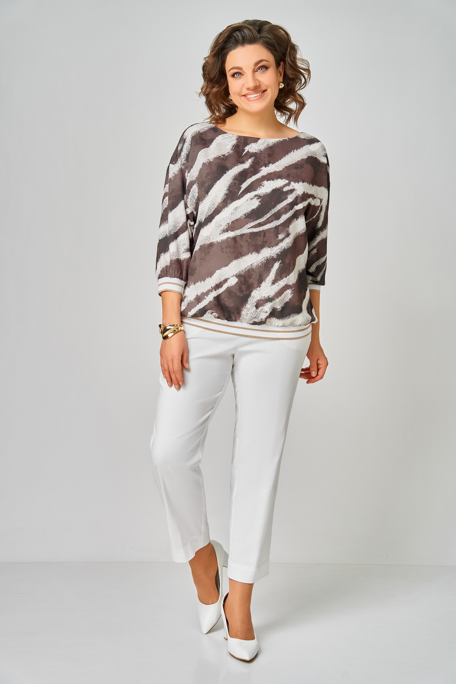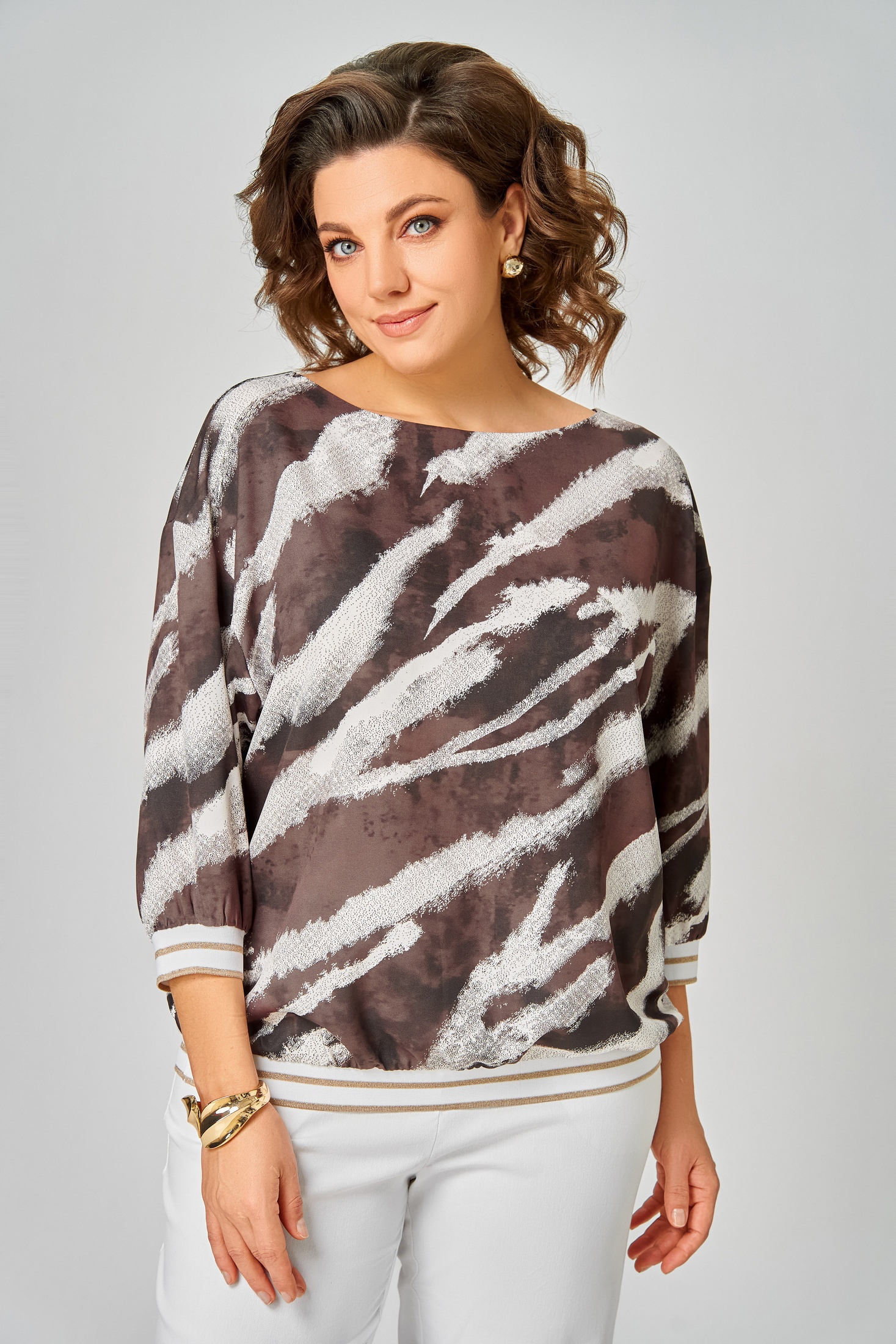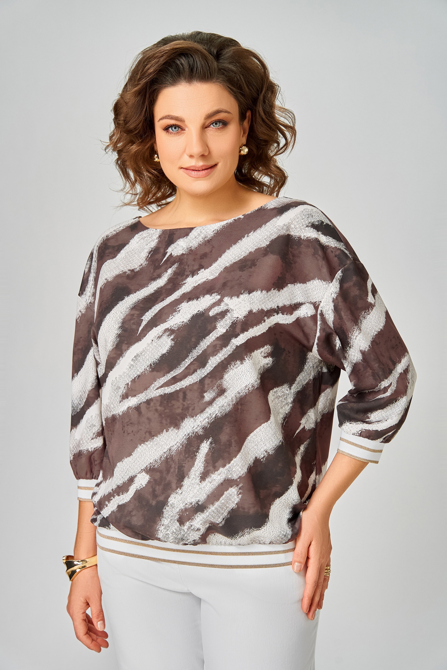 Блузка из мягкой вискозной ткани свободного силуэта со спущенной линией плеча. Горловина по полочке округлой формы, по спинке – V-образный вырез, который соединён планкой. Рукав длиной 3/4. Низ блузки и низ рукавов присобраны на декоративный трикотажный довяз. Длина блузки от высшей плечевой точки р.50,52,54 – 67(+/-1) см., р.56,58,60 – 69(+/-1) см. Длина рукава с манжетой от высшей плечевой точки – 55(+/-1) см.