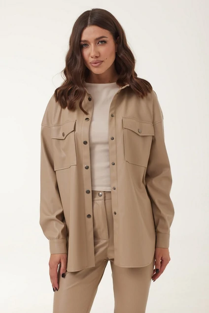 Рубашка женская прямого силуэта, выполнена из эко-кожи бежевого цвета. Вырез горловины округлый с отложным воротником. Застежка центральная на кнопки. По полочке на уровне груди накладные карманы с клапанами. Линия плеча расширена. Рукава втачные одношовные длинные, с манжетой по низу. Низ фигурный, с закруглением к боковым швам. Длина по спинке от края горловины 74 см, длина рукава 50 см.