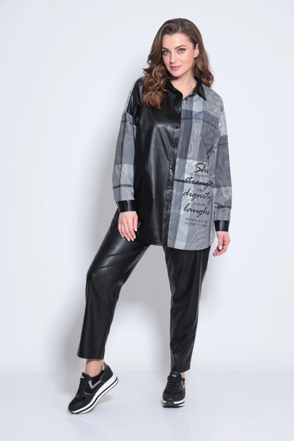 Рубашка женская, прямого силуэта, выполнена из двух видов материала: экокожа и текстильное полотно. Горловина оформлена рубашечным отложным воротником на отрезной стойке. Застежка центральная на петли и пуговицы. Одна полочка в нижней части изделия задекорирована принтом. Рукав длинный, со спущенной линией плеча, по низу на манжете. Манжета с застежкой на петлю и пуговицу. Снизу по бокам разрезы. По переду линия разреза скругленной формы, спинка без особенностей. Длина по спинке 78 см