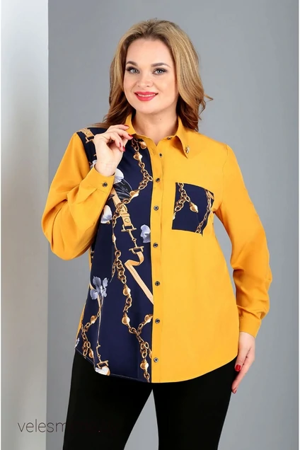 Блуза женская, удлиненная, свободного силуэта. Застежка на планку, по центру полочки. На спинке под двойной кокеткой обработана встречная складка. Воротник рубашечный, на стойке. Рукав с притачным манжетом, длиной 61,5 см. Правая полочка и левый нагрудный карман выполнены из отделочной ткани с принтом. На полочках выполнены нагрудные вытачки для лучшего баланса на фигуре. Изделие комплектуется украшением, которое может отличаться от представленного на фото.