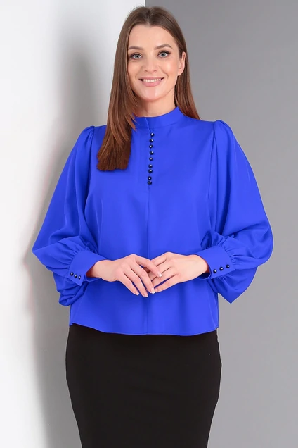 Модная блузка оригинального дизайна имеет потрясающий фасон, который подходит для дам с любыми особенностями фигуры. Своим оригинальным кроем она отличается от простых блузок. Изделие имеет потрясающий фасон, фиксированное по горловине на воротник-стойку, зрительно короткие плечевые швы, придают изделию женственность и романтизм, но очень свободное по ширине рукава, проймах. Рукав в верхней части оката присборен, что позволяет скрыть полноту рук. Застежка центральная, на планку с навесными петлями.