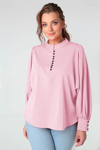 Модная блузка оригинального дизайна имеет потрясающий фасон, который подходит для дам с любыми особенностями фигуры. Своим оригинальным кроем она отличается от простых блузок. Изделие имеет потрясающий фасон, фиксированное по горловине на воротник-стойку, зрительно короткие плечевые швы, придают изделию женственность и романтизм, но очень свободное по ширине рукава, проймах. Рукав в верхней части оката присборен, что позволяет скрыть полноту рук. Застежка центральная, на планку с навесными петлями.