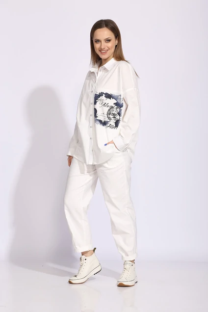 Рубашка из хлопка, прямого силуэта, объемная, по переду и спинке отрезные кокетки.Рукав длинный со спущенной линией плеча. По низу рукава приточная манжета с застёжкой на петлю и пуговицу. Воротник рубашечный на отрезной стойке. Застёжка центральная, оформлена отрезной планкой на петли и пуговицы. По переду от кокетки, ассиметричный декор-принт. Низ рубашки фигурной формы. Длина по спинке 67,8 см. длина рукава 39 см. На фото с песочными брюками 1052 рр.44-62 и молочными 1055 рр.46-56. На видео с брюками из экокожи м.930 рр.48-62.