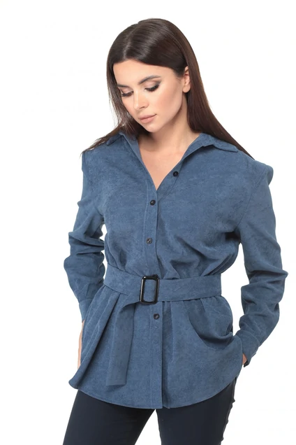 Стильная рубашка свободного силуэта из штруксовой ткани. Воротник рубашечного типа на притачной стойке. Идеально сочетаеться с брюками или джинсами. По спинке-отрезная кокетка. По переду-застёжка на петли-пуговицы. Воротник-рубашечный, на стойке. Рукава длинные одношовные на манжетах. Пояс из основной ткани входит в комплект. Длинна изделия по спинке в 44-48 размере-73см, длинна рукава-58см. (На фото модель 44р. рост -168см).