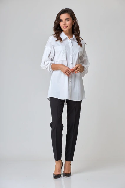 Стильная рубашка типа оверсайс, прекрасно сочетается с брюками от костюма и нетолько. Воротник рубашки на притачной стойке. По спинке -отрезная кокетка выполнена из ткани компаньена -ришелье. По переду - застежка на петли-пуговицы, один карман из ткани-ришелье. Рукава - спущенные, одношовные, низ на резинке из ткани ришелье. Модель актуальна круглый год. Длинаизделия рубашки по спинке –81 см ,рукав (длинна от проймы) –40 см от проймы85 (На фото модель 44р. Рост -168см.)