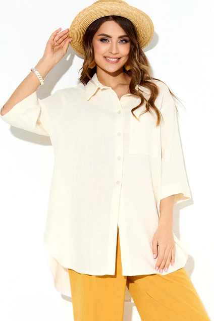 Удлиненная рубашка прямого силуэта из хлопка. Рубашечный воротник, накладной карман слева по полочке. Застежка на пуговицы до талии. Сзади кокетка с застроченной от нее складкой и разрез внизу. По бокам скругленные разрезы, сзади рубашка немного длиннее.