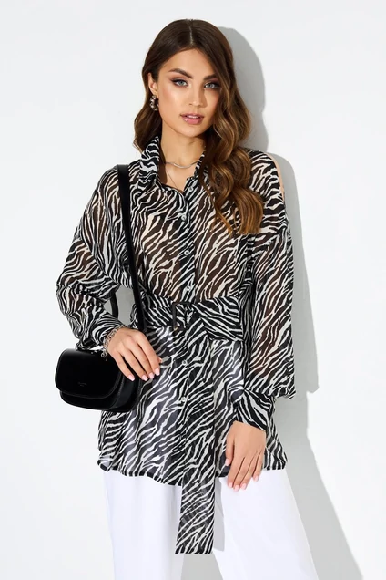 Рубашка из легкой принтованной ткани прямого силуэта с регулировкой талии втачным поясом по переду. Рубашечный воротник, застежка на пуговицы до низа, рукав на спущенной пройме, длинный с высокой манжетой.