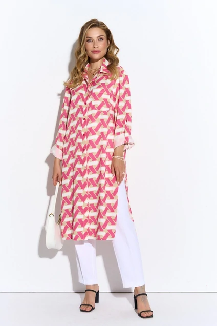 Удлиненная блузка из легкой принтованной ткани. Рубашечный воротник, втачной длинный рукав на манжете, застежка на пуговицы до низа, высокие разрезы по бокам.