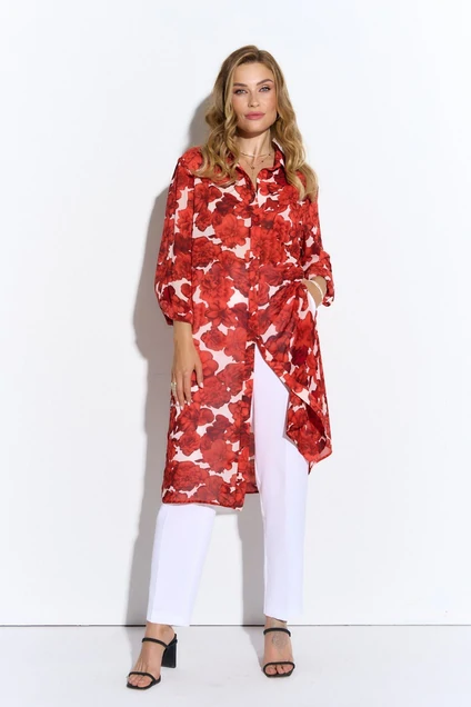 Удлиненная блузка из легкой принтованной ткани. Рубашечный воротник, втачной длинный рукав на манжете, застежка на пуговицы до низа, высокие разрезы по бокам.