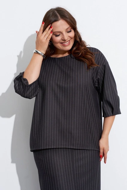 Блуза объёмная, прямого силуэта, с мягкой линией плеча и рукавами в ¾ длины. Низ переда и спинки фигурный, разной длины. Горловина округлая, на спинке обработана короткая металлическая молния. Низ рукавов со складками.