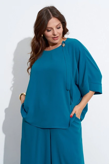 Просторный ,прямой блузон с мягкой линией плеча. Округлая горловина обработана широкой бейкой. Рукава расширены к низу и собраны в складки на манжеты. В боковых швах разрезы. Спинка длиннее переда.