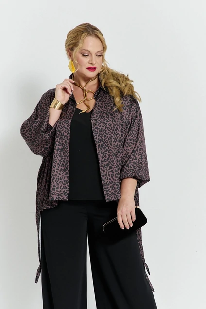 Объёмная блуза с мягкой линией плеча, рубашечным воротником на отрезной стойке, с кулисой по низу спинки. Застёжка на пуговицы, рукава на манжетах без застёжки.